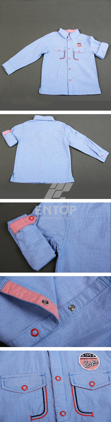 Styling: long sleeves with contrast fabric at collar stand, and back of placket, fake pockets with decoration stitching and flaps, front plackets with poppers, patch on left pocket flap